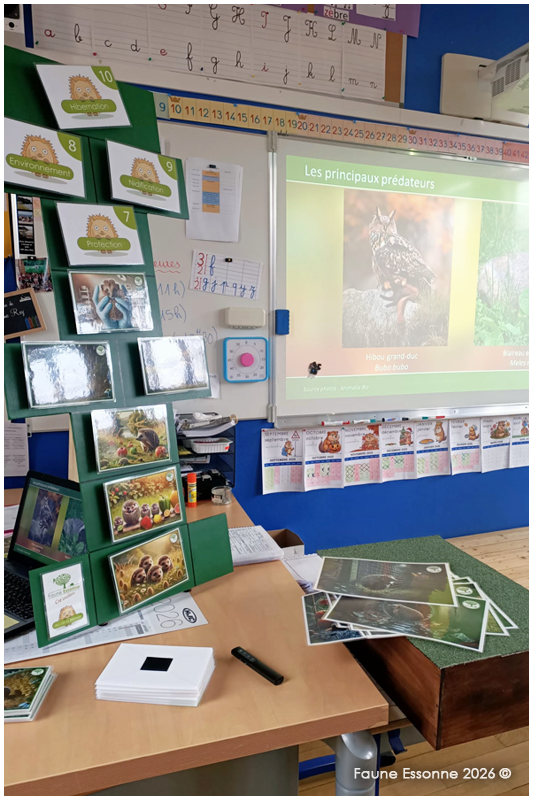 L’intervention, animée par Sabine et Valérie, a eu lieu le 13 février 2026. Durant deux heures, les élèves ont pu découvrir le hérisson ainsi que son parcours dans notre centre de soins, au travers de jeux, comme notre marelle, nos puzzles et notre jeu électronique, associés à un diaporama et à des vidéos montrant l’évolution des choupissons jusqu’au stade adulte, avec leur parcours depuis leur arrivée au centre jusqu’à leur départ.