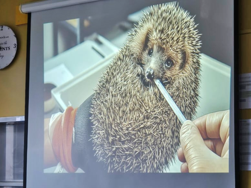 Au programme : reconnaître la teigne et la gale, savoir distinguer les selles normales des selles anormales, l'auto-lubrification, manipulation des hérissons, contrôle quotidien de l’état du hérisson et administration de traitements par voie orale. La session, mêlant théorie et pratique, s'est déroulée toute la matinée. Lou et Sylvie se sont prêtées à l'exercice de l'administration orale d'un traitement sur Constant et Malou, deux hérissons en soins actuellement qui ont permis de mettre en place le traitement de manière pratique. Cette formation a été très appréciée et d'autres sessions sur les mêmes thématiques seront prochainement proposées par Véronique. Un grand merci aux participantes et à Véronique pour ce partage de connaissances !
